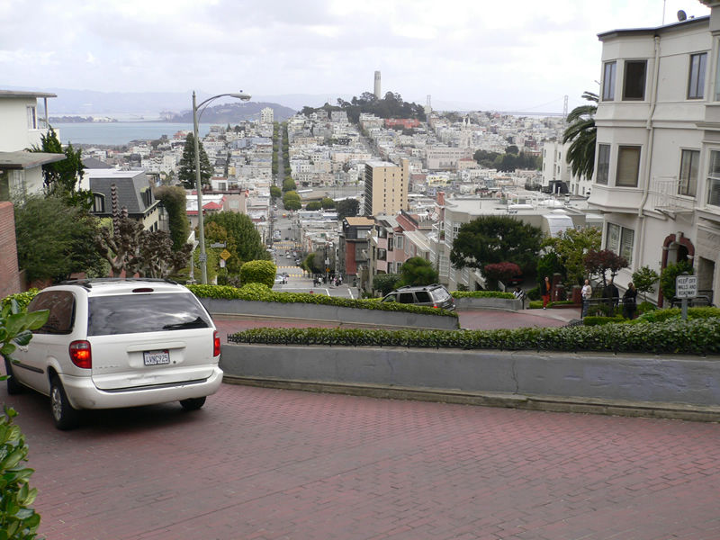 So sieht die kurvigste Straße der Welt von oben aus. Im Hintergrund der Coit Tower und die Oakland Bay Bridge