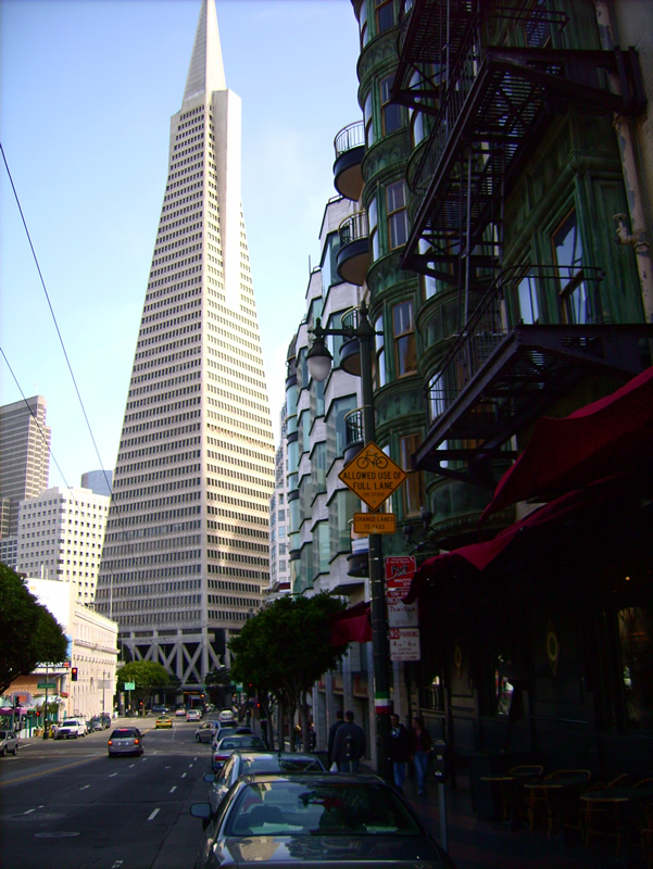 Gegensätze: Die Feuerleitern der alten Gebäude vor der alles überragenden Pyramide