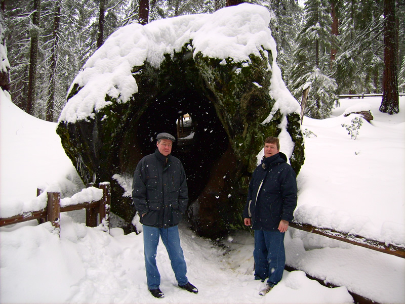 Durch diesen umgekippten Sequoia kann man aufrecht (!) durchgehen. Übrigens ist es gerade richtig am schneien, wie man sieht