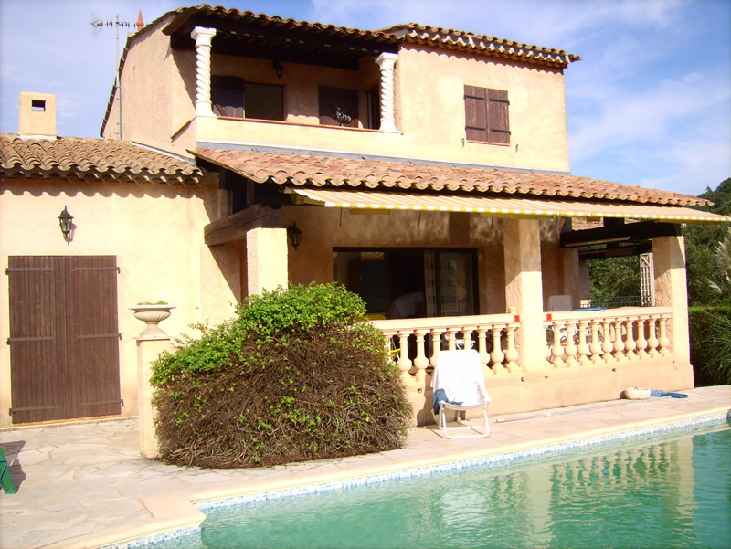 Ein schönes Bild vom Haus in der Sonne: Oben der Balkon zu den beiden Schlafzimmern, unten grenzt der Pool direkt an die Terrasse an