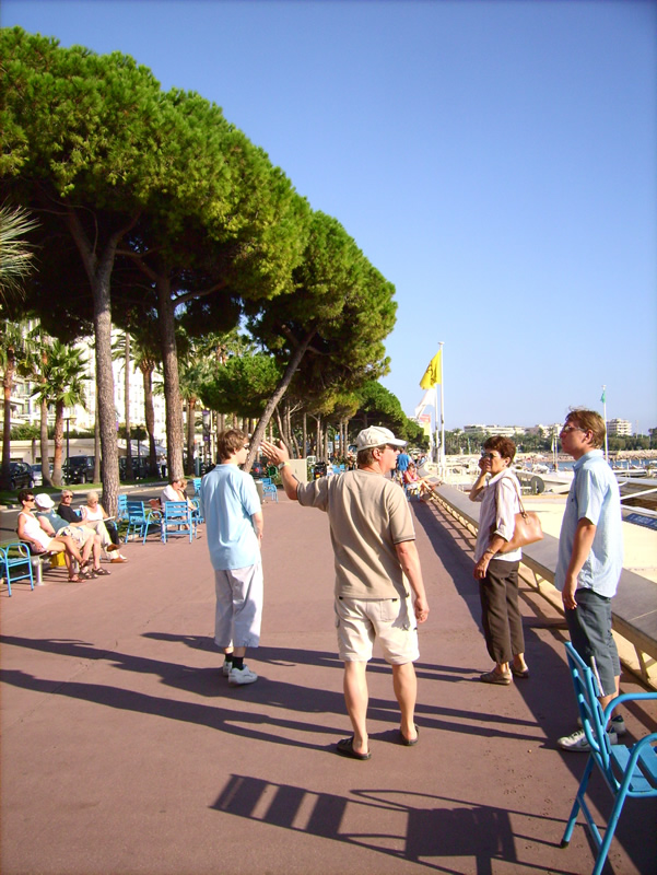 An der Croisette finden sich links Hotels, rechts Strand und dazwischen Bäume