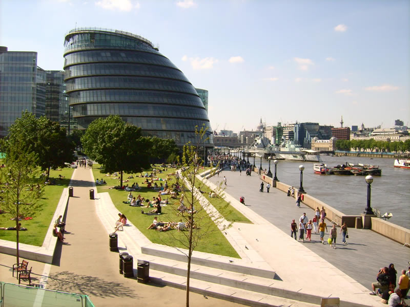 Das neue Londoner Rathaus (Baujahr 2005) ist wahrscheinlich einem Ei nachempfunden... Rundherum wurde das Themseufer aber sehr ansprechend gestaltet.