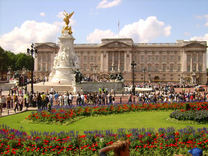 Ein sensationelles Foto vom Buckingham Palace mit dem Queen Victoria Memorial, umgeben von sehr gepflegten Gartenanlagen