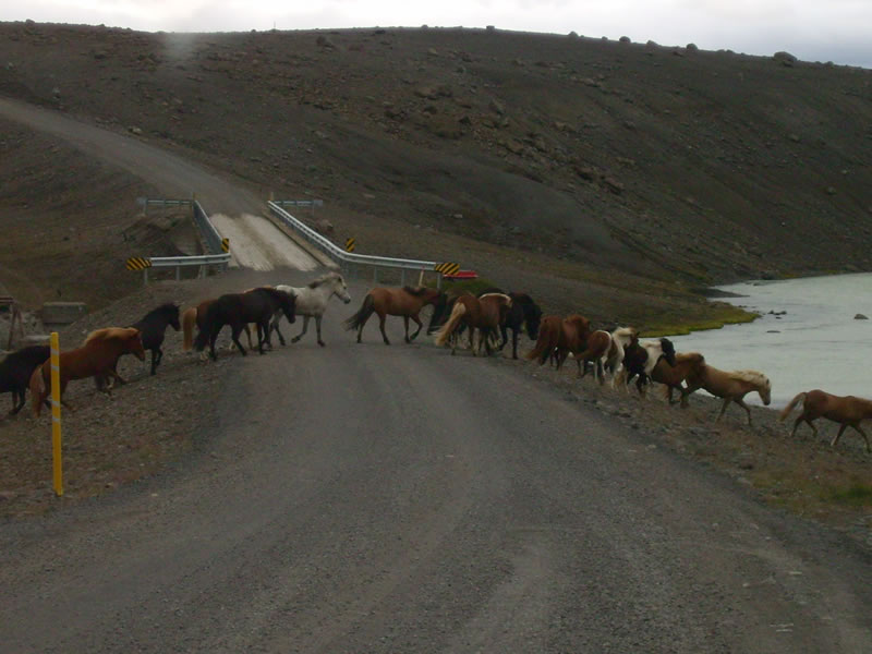 Eine Herde der berühmten Isländer-Pferde kreuzt zu unserer großen Überraschung den Weg