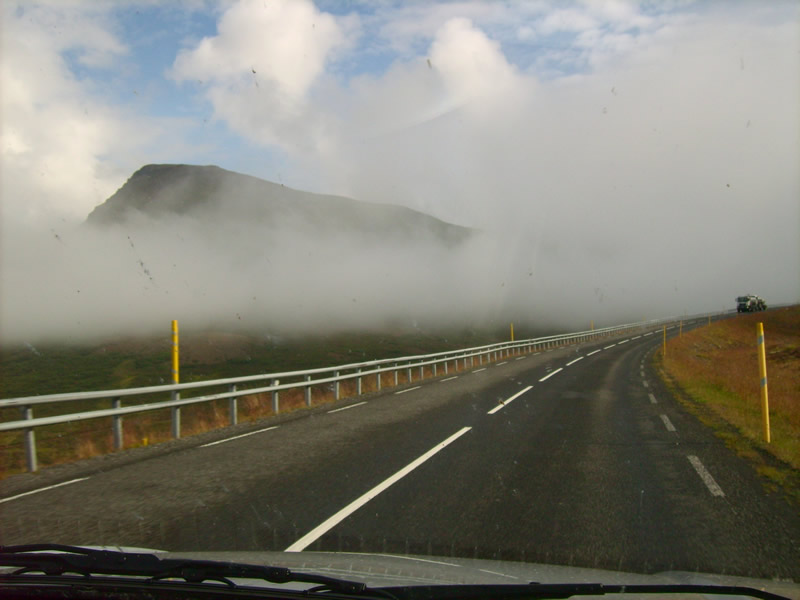 Die Wolken hängen so tief, dass man sogar mitten durch fahren muss