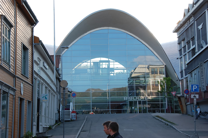 Zwischen den ganzen Holzhäusern wirkt die moderne Bibliothek fast wie ein UFO