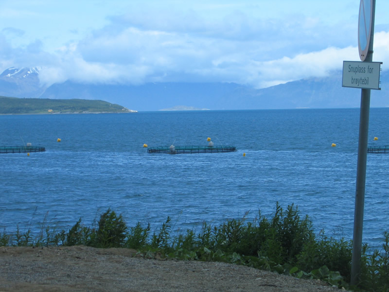 Ab und zu sieht man diese kreisrunden Lachsfarmen im Wasser, in denen unser Lieblingsfisch gezüchtet wird