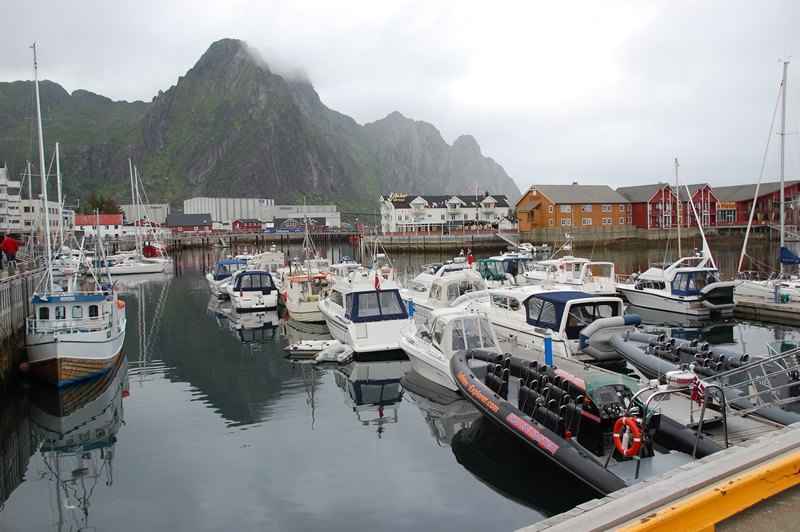 Svolvær Hafen mit den allgegenwärtigen Bergen im Hintergrund