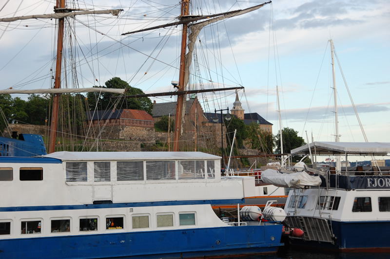 Blick quer über den Hafen auf Akershus Festung & Schloss