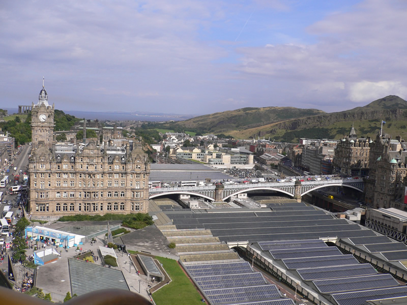 Unten rechts sieht man den Hauptbahnhof Waverly Station, im Hintergrund kann man den Firth of Forth erspähen