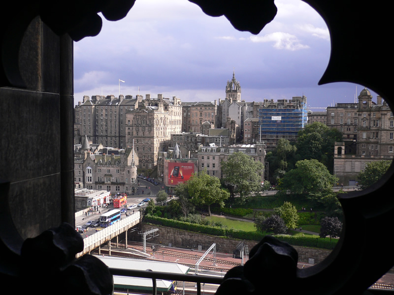 Im Hintergrund sieht man die einer Krone nachempfundene Spitze des Glockenturms der St. Giles Cathedral