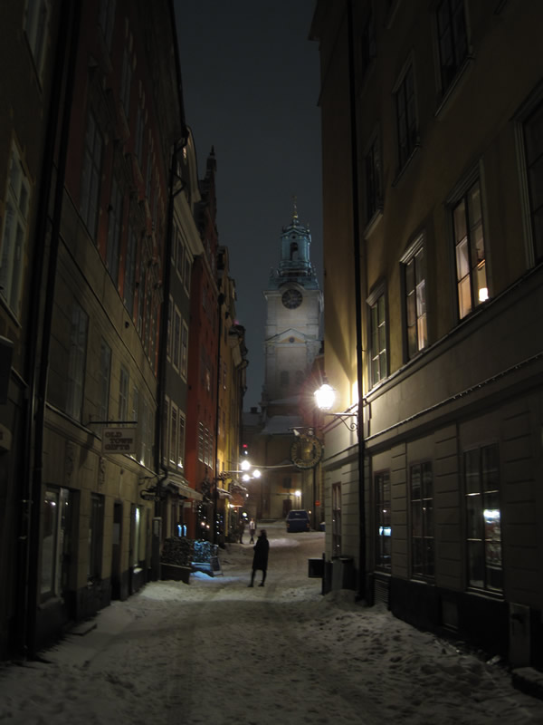 In den Gassen der Gamla Stan. In der linken Bildhälfte die typischen bunten Häuser am Stortorget
