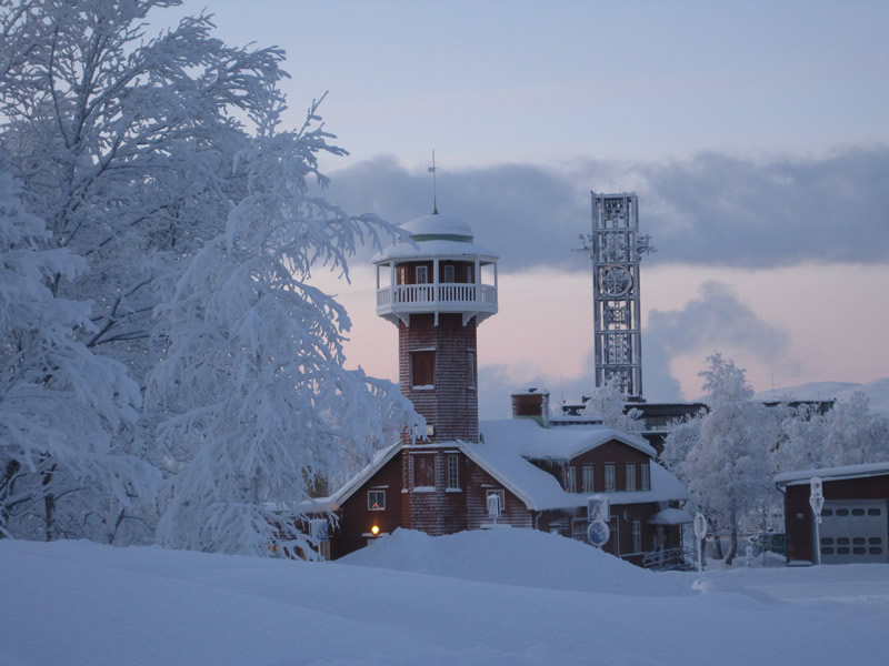 Die Feuerwehr im Vordergrund, der Uhrenturm im Hintergrund ist auch von der Minengesellschaft LKAB gesponsort