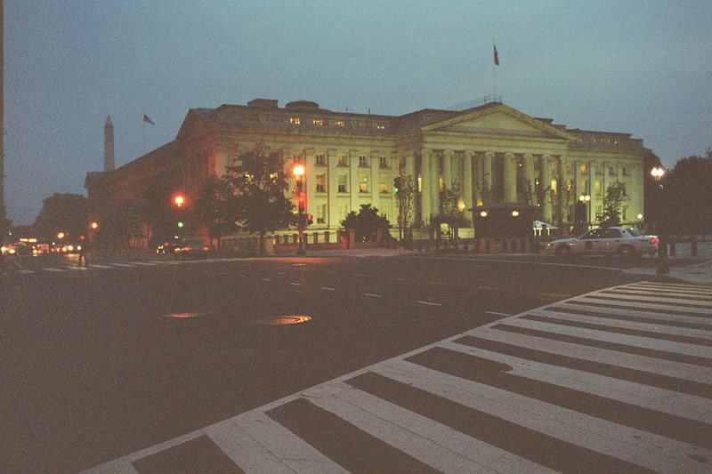 Das Finanzministerium der USA, im Hintergrund die Spitze des Washington Monuments