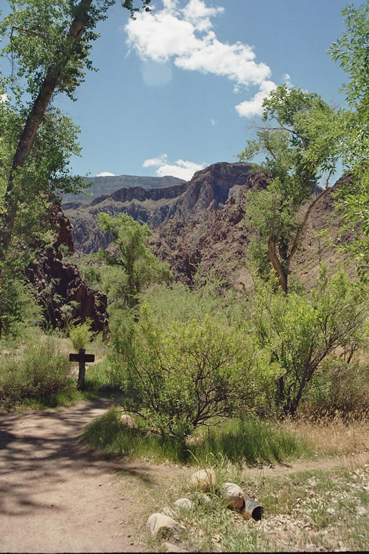 Ganz oben sieht man den South Rim, etwa 1600m über uns: Da kommen wir her! Diesen Punkt hier haben wir von oben wahrscheinlich wiedergefunden