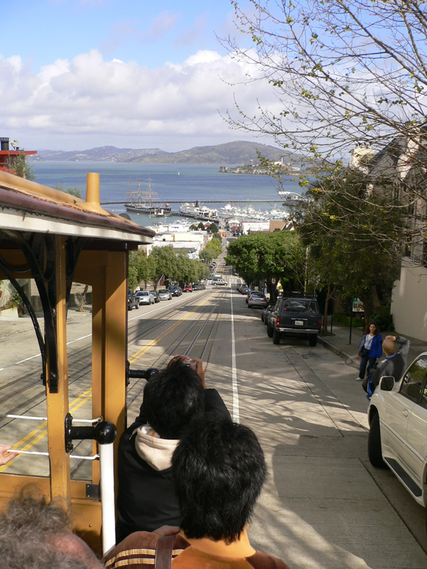 Ein traumhafter Blick von der ganz schön steilen Hyde (?) Street auf den Hafen und Alcatraz