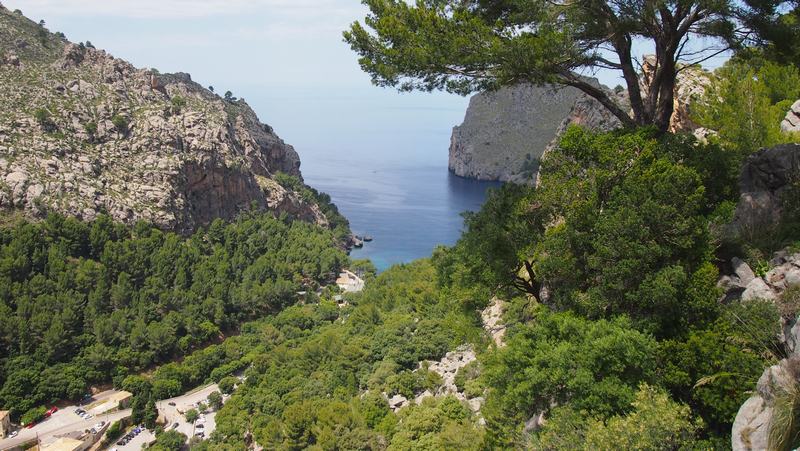 Von oben sieht man deutlich die von hohen Felsen eingerahmte Bucht von Sa Calobra