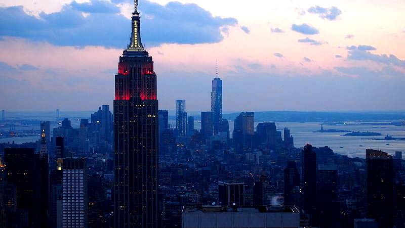 Empire State Building by night, im Hintergrund das neue 1 WTC (417 m + Spitze)