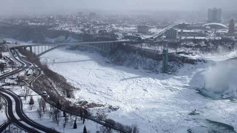 Der sonst reißende Niagara River versteckt sich unter einer dicken Eis- und Schneedecke